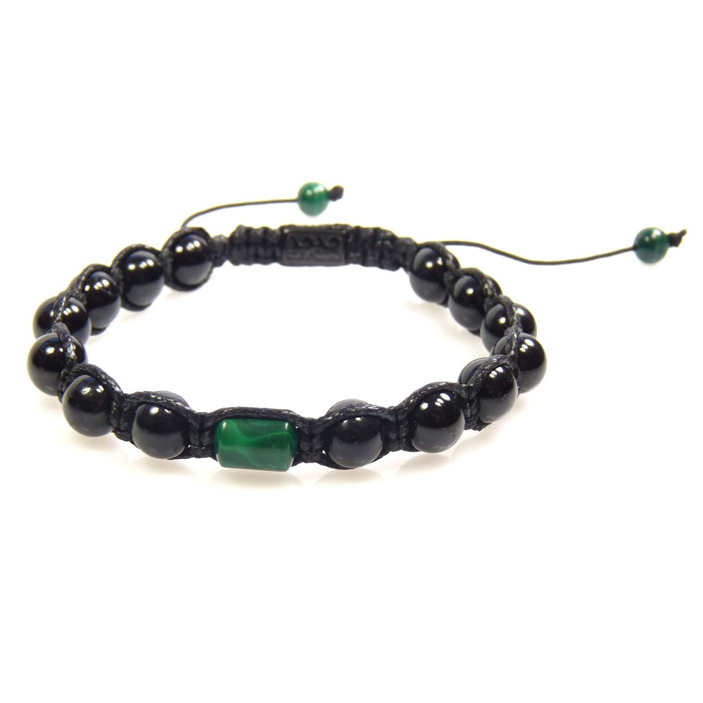 Ręcznie pleciona bransoletka z naturalnych kamieni, w której spotykają się głęboka czerń turmalinu i zieleń malachitu.