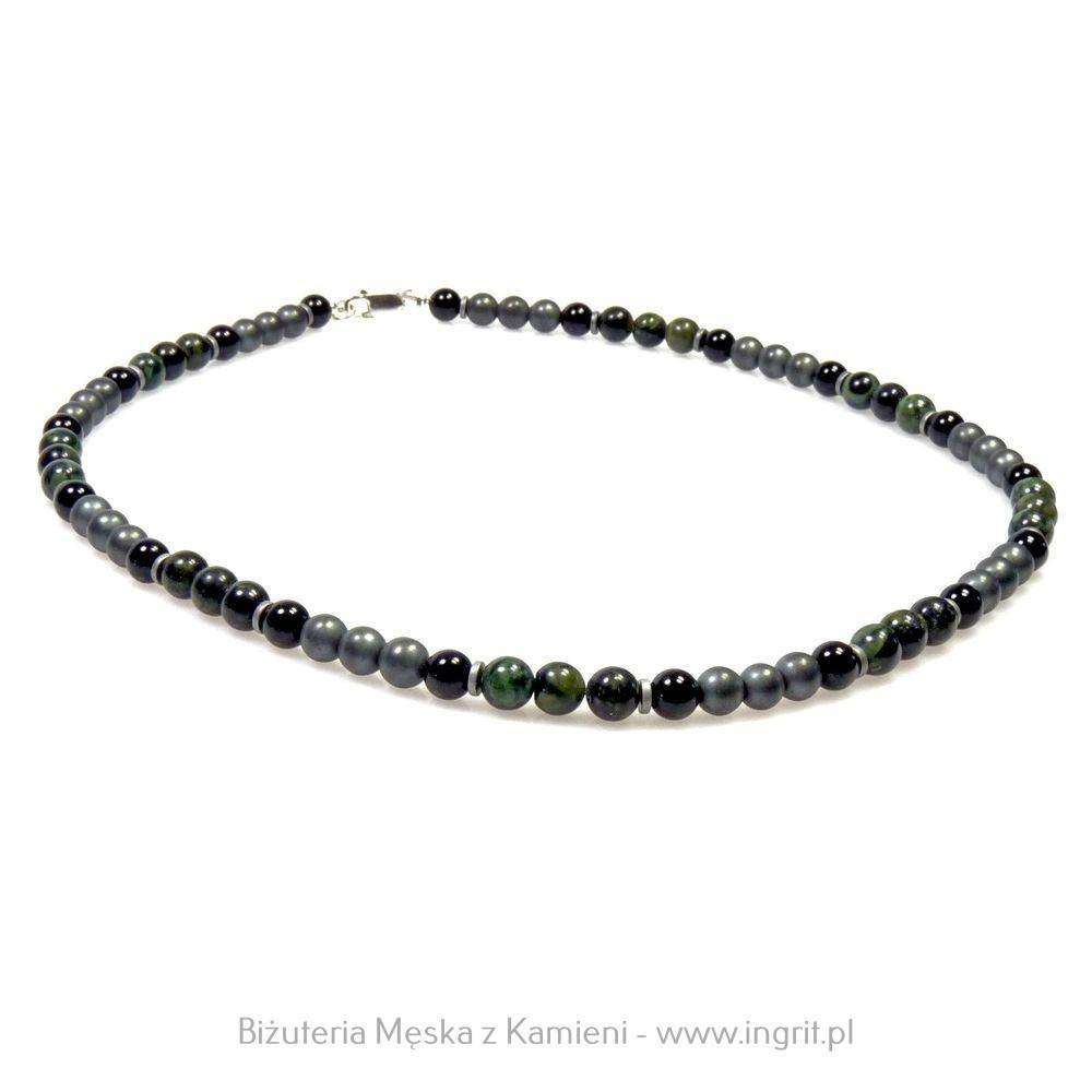 Modny naszyjnik męski z matowego hematytu, polerowanego onyksu i jaspisu kambaba. Kamienie zostały nawleczone na bardzo wytrzymałą linkę jubilerską, powlekaną nylonem dla zwiększenia komfortu noszenia i zakończoną zapięciem typu karabińczyk wykonanym ze srebra.